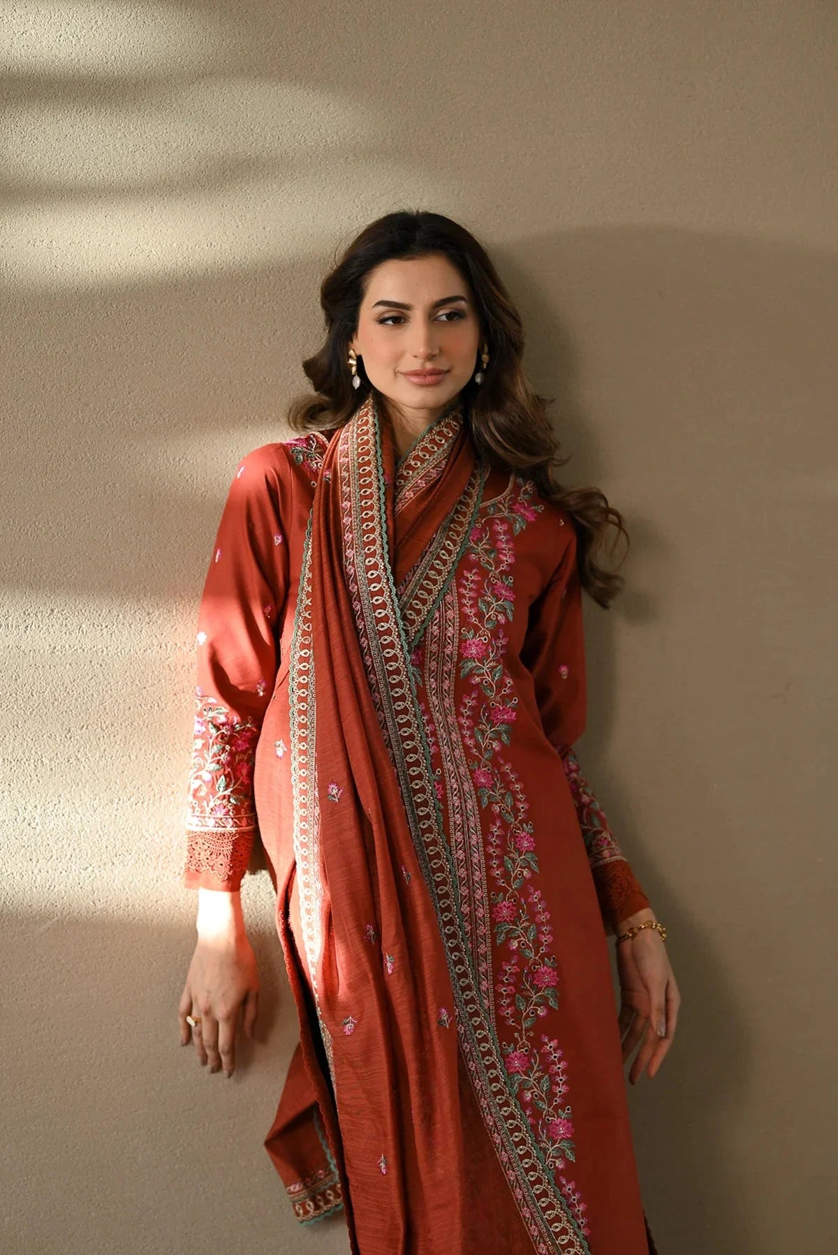ZAIB - 3PC DHANAK EMBROIDERED SHIRT WITH DHANAK EMBROIDERED SHAWL AND TROUSER - HZU2595